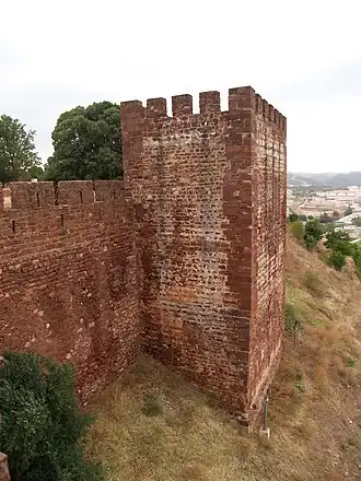 As a place of strategic significance, the fortifications of Silves were extensive, but perhaps not "fully developed" in 1189. They had been sufficient to require siege engines during the siege of 1063.[8] The Almohads had made repairs after taking full control in 1157.[14] The hilltop was surrounded by a rampart of rammed earth faced with stone. It had at least seventeen towers of the albarrana type, that is, set outside the wall and connected to it by means of elevated walkways. The tower below the main gate was especially large. They were not hollow structures but rather elevated fighting platforms, solid to a height equal with the walls. Two parallel walls led down from the hilltop to the river, protecting the water supply, which was also protected by four towers.[15] The author of the Narratio calls the walled section leading to the river a corrasce, from the local Romance word couraça, "breastwork".[16][17] The suburb at the base of the hill had a weaker system of walls and was protected by a single tower. The fortifications are described in detail by al-Idrīsī.[15]