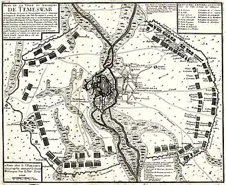 The fortifications were always in a state of repair and enhancement. Most were made of earth hardened by palisades of whitewashed tree trunks, which were ineffective against 18th-century cannons. The only masonry buildings were the castle, the mosques and the courtain surrounding the Angevin Fortress in the southern part of the city. All of the other buildings were made of wood, making them prone to destruction by fire.[15][16] On 21 August 1716, General Joachim Ignaz von Rotenhan reached Timișoara with 14 cavalry squadrons. On 25 August, 16 cavalry regiments under the command of János Pálffy and 10 infantry battalions under the command of Charles Alexander, Duke of Württemberg arrived in Beregsău Mare. The other troops, including Eugene of Savoy's, arrived on 26 August. János Pálffy and his cavalry settled to the south of the fortress, with the purpose of blocking any Ottoman attempts to fetch reinforcements. Eugene of Savoy set up his General Staff, infantry, artillery and some cavalry to the northern part of the fortress, completely surrounding it. The besiegers had approximately 30,000 hand grenades and 760 tons of gunpowder.[6][12][17][18] On 28 August, the besiegers captured the summer residence of the Turkish governor, Pasha's Well, which the Ottomans set on fire before they retreated.[6][12][18]