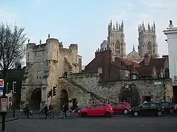 ![]() Micklegate Bar and part of the City walls. In 1644, there was a barbican in front of the gate | |||||||