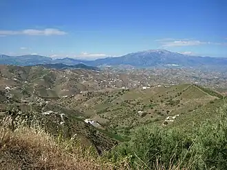 The Sierra de Tejeda is a small mountain range running in a northwest to southeast direction.[2] It lies in the east of the Málaga and the southwest of the Granada. It covers an area of 6,755 square kilometres (2,608 sq mi).[3] The Sierre de Tejeda lies to the southeast of the Sierra de Alhama and to the northwest of the Sierra de Almijara.[4] The Sierras of Tejida and Almijara form a single range about 40 kilometres (25 mi) west of the Sierra Nevada.[5] The mountains form part of a barrier between the coast and the interior.[6]