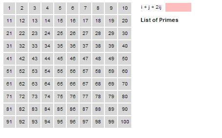 The sieve starts with a list of the integers from 1 to n. From this list, all numbers of the form i + j + 2ij are removed, where i and j are positive integers such that 1 ≤ i ≤ j and i + j + 2ij ≤ n. The remaining numbers are doubled and incremented by one, giving a list of the odd prime numbers (that is, all primes except 2) below 2n + 2.