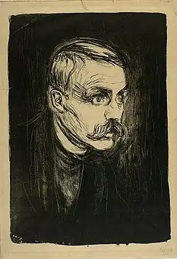 Primarily known as a writer of poetry, Obstfelder's debut collection of poems from 1893, Digte (Poems), is usually credited as one of the earliest examples of modernism in Norwegian literature. Despite producing a relatively small amount of works during his short lifespan, he is considered one of the most important figures in Norwegian literature of the late 19th century. Strongly influenced by the French poet Charles Baudelaire, his writings have often been described as the literary equivalent of Edvard Munch's paintings; indeed, Munch made two lithographs of Obstfelder, who in turn wrote an essay in Munch's defense for Samtiden in 1896. Additionally, Munch was mysteriously in possession of some of Obstfelder's manuscripts.[8] Obstfelder was a source of inspiration for Rainer Maria Rilke's work The Notebooks of Malte Laurids Brigge.[9]