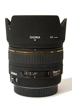 The Sigma 30mm f/1.4 EX DC HSM is a wide-aperture photographic lens made by the Sigma Corporation, equipped with a Hyper Sonic Motor (abbreviated HSM, Sigma's trade name for photo lens focusing technology using ultrasonic motor). The lens was produced in Canon EF mount, Four Thirds System, Nikon F-mount, Pentax K mount, the SA mount, and the Sony/Minolta AF Mount varieties, all of the same optical formula. It shipped with a removable petal-type lens hood (62mm diameter). The lens assumes a crop factor of roughly 1.5, and therefore is not usable with on full-frame or 135 film cameras.