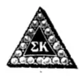 The current membership badge is a one-inch jeweled triangle with Greek letters Σ and Κ.[5] The triangle badge was chosen in 1894,[3] and later, jeweled badges were approved at the 1915 convention when the pearl was adopted as the national jewel. Unjeweled badges have a scroll edge. Badges are either made of silver, white gold or yellow gold.