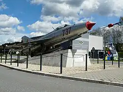 On 26 April 1955, Jähn enlisted into the predecessor of the East German Army in the town of Preschen and eventually worked his way into the East German Air Force. He finished basic training in 1956, enrolling at the officer's school in Kamenz, and was sent to flight school in the town of Bautzen, which would later become its own officer's school for military pilots. Jähn returned to his squadron, the Jagdfliegergeschwader 8, or Fighter Aviation Squad 8, two years later and remained there until 1960, when he and his team were relocated one last time to Marxwalde. During his flight career, he saved himself from crashing by ejecting from the MiG-17 he was piloting.[7] He worked as the Deputy Commander for Political Affairs in his squadron from 1961 to 1963, then headed the Air Tactics/Air Combat division until 1965. At the same time, Jähn passed his Abitur and was sent to the J.A. Gagarin Air Force Academy in Monino, just outside of Moscow, Russia. Between 1970 and 1976, he was an inspector for fighter-pilot training and flight safety under the Deputy Head of the LSK/LV for Air Force Training of the Kommando LSK/LV.