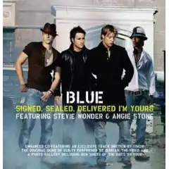"Signed, Sealed, Delivered I'm Yours" was covered in 2003 by English boy band Blue. Their version includes vocals from Angie Stone and Wonder. This was the second single from Blue's third album, Guilty (2003), and was released in Australia two weeks before it was issued in the UK. The cover peaked at number 11 on the UK Singles Chart and reached the top 20 on the charts of six other countries. Janet Jackson was originally approached to cover the song with the group but could not proceed due to scheduling conflicts.[29]