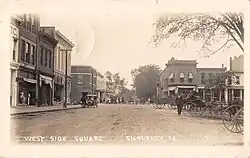 Keokuk County was opened for Euro-American settlement in 1843, and the town got its start in 1844 when S.A. James built the first cabin there. Other families began to settle there as well, and in 1844, the town was named by county commissioner Dr. George H. Stone in honor of popular poet Lydia Sigourney. A large oil-painted portrait of her still graces the foyer of the county courthouse.[5]