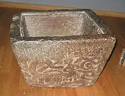 This baptismal font from c. 1100 is made of slate. It was discovered in pieces at the cemetery in Norum in 1847. On one side it shows Gunnar lying in the snake pit surrounded by four snakes and with a harp at his feet.[21] Gunnar in the snake pit was used as a Biblical typology similar to that of Daniel in the lion's den in representing Christ rising unharmed from Hell.[22] Above the snake pit panel is a runic inscription, which ends with five identical bind runes of which the last two are mirrored. The meaning of these five bind runes is not understood.