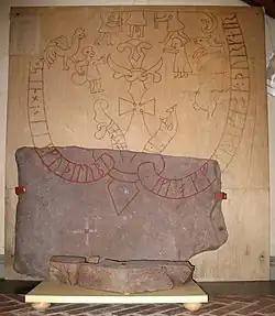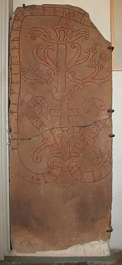 This runestone is found at the church of Årsunda and was documented during a survey in 1690.[16] The top of the stone shows a running man, who by comparison with U 1163 from Drävle can be identified as Sigurd.[16] A second figure holds a ring in his hand. A cross is in the center of the design. Similar to the Sigurd stones U 1163, U 1175, Sö 327, and Gs 2, this combination of a cross and the Sigurd figure is taken as evidence of acceptance and use by Christianity of legends from the Völsung cycle during the transition period from paganism.[3] The runic text, which is reconstructed from the 1690 drawing, uses a bind rune that combines the e- and l-runes in the name of the mother, Guðelfr.[17]