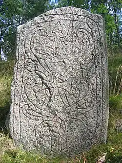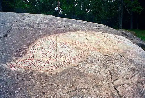 The Ramsund carving is not quite a runestone as it is not carved into a stone, but into a flat rock close to Ramsund, Eskilstuna Municipality, Södermanland. It is believed to have been carved around the year 1030.[8] It is generally considered an important piece of Norse art in runestone style Pr1.