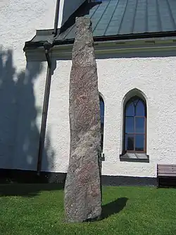 This sandstone runestone is classified as being carved in runestone style Pr2 and was rediscovered in 1974 outside the wall of the church of Österfärnebo. It is not listed as a Sigurd runestone by the Rundata project, and only the bottom part remains. The inscription is reconstructed based upon a drawing made during a runestone survey in 1690 by Ulf Christoffersson,[14] and originally included several figures from the Sigurd story, including a bird, Ótr with the ring, and a horse.[14]