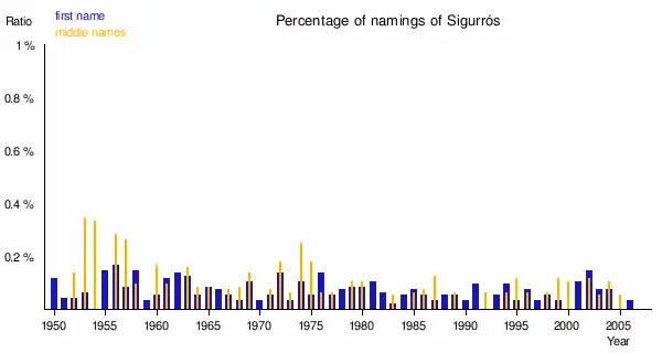 Sigurrós is an Icelandic female name, formed by conjoining sigur (victory) and rós (rose). Over 200 women currently carry it as their first given name and around 100 as their second or third given name.