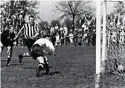 Sigvard "Kallinge" Pettersson (1928–2002) was a Swedish footballer and a centre forward in the classical 2-3-5 formation, who during his career in Landskrona BoIS represented the club at 313 occasions and scored 298 goals[1] – an average of 0.95 goals per game. Through the first 99 years of Landskrona BoIS' history, only Harry "Hacke" Dahl and Sonny Johansson have scored more goals for the club. Pettersson's nickname "Kallinge" came from the small Blekinge village where he grew up. During the later part of his many years in Landskrona BoIS he played together with Hasse "HP" Persson in the front.[2] In the 1980s, Pettersson was running a smaller tobacco shop in Landskrona. He died in 2002 at age 73.[3]