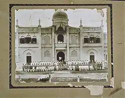The first known gurdwara was established by the Sikh Police Contingent at Pearl’s Hill.[8] Prior to this temple's establishment, the Sikh policemen of Pearl's Hill and their relatives held Sikh religious services within the confines of their barracks but this became a difficult situation with the increasing Sikh population, thus the need for a dedicated-structure for Sikh religious activities grew.[8] The civilian Sikh population at the time wanted their own gurdwara that was separate from the police-gurdwara, thus a civilian gurdwara was established at Queen Street.[8] This gurdwara formed out of the purchase of a large compound (with a bungalow) in 1912 by a committee of Sikhs led by the Sindhi merchant Wassiamull Assomull Mahtani.[8]