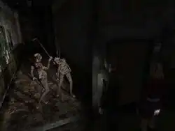 Much of the gameplay consists of navigating the town and finding keys or other items to bypass doors or other obstructions, with less focus on killing enemies.[4] Occasionally, puzzles will be presented, often with riddles left for the player to interpret.[4] The difficulty levels of the enemies and the puzzles are determined independently by the player before starting the game.[3] James keeps a radio with him, which alerts him to the presence of creatures by emitting static, allowing him to detect them even through the thick fog or darkness. Similar to the first game, the player can choose to turn off the radio if they want.[5] He also tilts his head in the direction of a nearby item or monster, giving clues to items that the player may miss while playing.[3] For combat, he finds three melee weapons and three firearms throughout the game, with another two melee weapons unlocked during replays. James can move and shoot while equipped with a handgun, but he cannot move and shoot with a shotgun or rifle. James cannot aim up or down and the player will have to rely on the game's auto-aim to hit enemies that are on the ceiling.[3] "Health" restoratives and ammunition can be found throughout the game.[5]