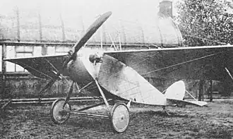 Its wood-framed, thin section wing was in two parts joined to the upper fuselage longerons and was fabric covered. It was entirely wire-braced from a high, central cabane above the fuselage and a short cabane from its underside.[1]