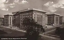 Designed by architect Ludwik Wojtyczko, the Silesian Parliament was built in 1925–1929 in the Stripped Classicist style. For a very long time it was the biggest structure in Poland.[1] Currently it hosts the offices of the Silesian Voivodship. The building has seven floors and contains one of four paternoster lifts currently in use in Poland. The Polish architect Adolf Szysko-Bohusz announced a competition for the design of the new Silesian Parliament in 1925, who wished the building to espouse the local Polish cultural identity of the region, instead of the more customary German/ Prussian style. When the building was inaugurated in May 1929, Michal Grazynski, President of the Province of Upper silesia, called the building a "material symbol of Polish culture and power".[2]
