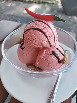 Sili ice cream is a Filipino ice cream flavor prepared using labuyo chili, coconut milk, puréed strawberries and sugar. It was invented by the 1st Colonial Grill restaurant in Albay in 2004 and has since become a highly popular flavor. It is associated with and inspired by the regional cuisine of Bicol, which characteristically serves spicy dishes in coconut milk.[1][2][3][4][5]