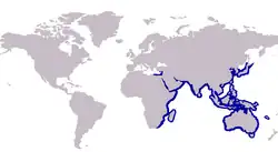 The Sillaginidae are distributed throughout the Indo-Pacific region, ranging from the west coast of Africa to Japan and Taiwan in the east, as well occupying as a number of small islands including New Caledonia in the Pacific Ocean.[18] While they have a fairly wide distribution, the highest species densities occur along the coasts of India, China, Taiwan, South East Asia, the Indonesian Archipelago and northern Australia.[6] One species of sillaginid, Sillago sihama, has been declared an invasive species to the Mediterranean, passing through the Suez Canal from the Red Sea since 1977 as part of the Lessepsian migration, becoming widespread.[23]