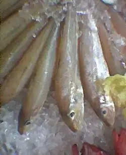 The smelt-whitings are benthic carnivores, with all of the species whose diets have been studied showing similar prey preferences. Smelt-whitings have well-developed chemosensory systems compared to many other teleost fishes, with high taste bud densities on the outside tip of the snout. The turbulence and turbidity of the environment appear to determine how well developed the sensory systems are in an individual.[27] Studies from the waters of Thailand, Philippines and Australia have shown that polychaetes, a variety of crustaceans, molluscs and to a lesser extent echinoderms and fish are the predominant prey items of the family.[28][29][30] Commonly taken crustaceans include decapods, copepods and isopods, while the predominant molluscs taken are various species of bivalves, especially the unprotected siphon filters that protrude from the shells. In all species studied, some form of diet shift occurs as the fishes mature, often associated with a movement to deeper waters and thus to new potential prey. The juveniles often prey on planktonic prey, with small copepods, isopods and other small crustaceans often taken.[31] Whilst many species have a change in niche to reduce intraspecific competition, there are often many species of sillaginid inhabiting a geographical area. Where this occurs, there is often definite diet differences between species, often associated with a niche specialization.[30] The sillaginid's distinctive body shape and mouth placement is an adaptation to bottom feeding, which is the predominant method of feeding for all whiting species. All larger whiting feed by using their protrusile jaws and tube-like mouths to suck up various types of prey from in, on or above the ocean substrate,[26] as well as using their nose as a 'plough' to dig through the substrate.[6] There is a large body of evidence that shows whiting do not rely on visual cues when feeding, instead using a system based on the vibrations emitted by their prey.[32]