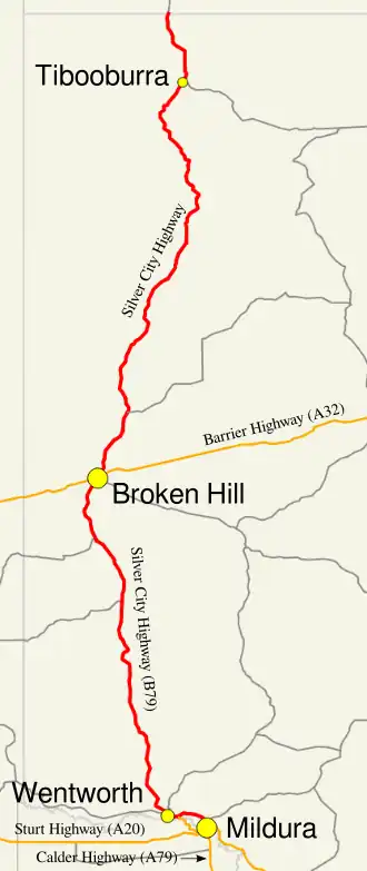 Silver City Highway is a 683-kilometre-long (424 mi)[1] highway that links Buronga, New South Wales to the Queensland border via Wentworth, Broken Hill, and Tibooburra, in the arid Far West region of New South Wales; a short branch also connects to Calder Highway on the Victorian border at Curlwaa (signed as Calder Highway). The namesake of the highway is derived from the moniker for Broken Hill – the "Silver City" – which the highway travels through. The highway is designated route B79 from Broken Hill to Buronga.