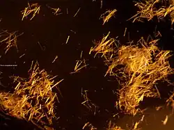 Fulminates are toxic, about the same as cyanides.[3] When pure, silver fulminate is chemically stable, not decomposing after years of storage. Like many silver salts, it darkens with light exposure. It is slightly soluble in cold water and can be recrystallized using hot water.[3][6] It can also be recrystallized from a 20% solution of ammonium acetate.[3] It is not hygroscopic and can explode when moist or under water; it was reported to remain explosive after 37 years under water.[3] It explodes upon contact with concentrated sulfuric acid or chlorine or bromine, but not when contacting iodine.[3] It is insoluble in nitric acid, but dissolves in ammonia, alkali chlorides, alkali cyanides, aniline, pyridine, and potassium iodide by forming complexes.[3] Concentrated hydrochloric acid decomposes it non-explosively with a hissing noise; thiosulfate also decomposes it non-explosively, and can be used for disposal.[3]