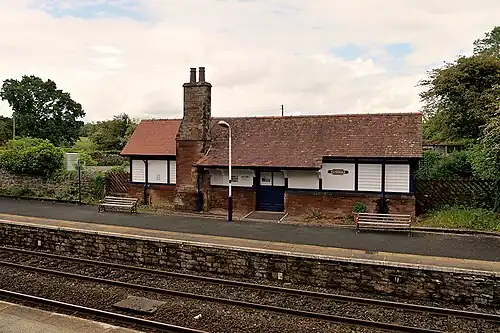 There is no footbridge or underpass; passengers cross the line at track level via a barrow crossing (so disabled travellers are not recommended to use the southbound platform without assistance).[1] The station buildings have been converted for residential use, but there are shelters on each side.[2] There is a small car park. A ticket machine is available, so travellers can purchase tickets (or a permit to travel if not in possession of a credit or debit card) here prior to boarding. Train running information is provided via digital information displays and timetable posters.