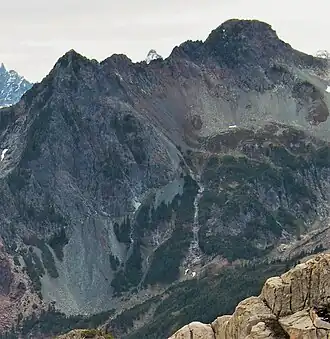 Silvertip Peak is a 6,140-foot (1,870-metre) mountain summit located in the North Cascades, in Snohomish County of Washington state.[4] It is situated 3.5 miles south of Barlow Pass along the Mountain Loop Highway, in the Henry M. Jackson Wilderness, on land managed by Mount Baker-Snoqualmie National Forest. Precipitation runoff from the mountain drains north into tributaries of the Sauk River, or south into headwaters of Silver Creek which is a tributary of Skykomish River. Neighbors surrounding Silvertip include Gothic Peak, Del Campo Peak, Sheep Mountain, Cadet Peak, and Columbia Peak. Silver Lake and Poodle Dog Pass lie on the east flank of Silvertip, the Monte Cristo mining ghost town sits at the northeast base, and the Mineral City ghost town is at the southern foot of this peak. This peak was named in association with the nearby Silver Tip mining claim.[3]
