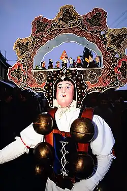 The characters represent either men or women, but in fact only men take part in the groups, due to the heavy costumes, the weight of the very large bells or the many jingle bells.