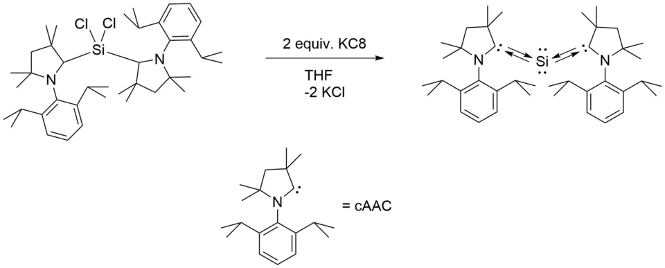 The first cAAC stabilized silylone was first reported by Mondal et al. in 2013 (where cAAC is ligand used was :C(CH2)(CMe2)2N-2,6-iPr2C6H3).[1] The complex was synthesized by reduction of (cAAC)2SiCl2, a stable biradical precursor species, with two equivalents of potassium graphite (KC8) reducing agent in tetrahydrofuran (THF) solution.[3] Under this preparation, 95% yield of product was achieved and formed a dark blue solution in hexane with rod-shaped crystals.[3] The crystallized product was found to be stable under inert atmosphere and unreactive towards hydrogen gas, carbon dioxide, and ammonia.[4] Furthermore, they were found to melt at 195 °C and decompose at 220 °C.[4]