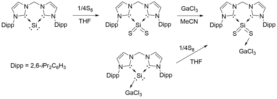 bis-NHC stabilized silylones have also been found to react with chalcogens to form silicon(II) monochalcogenides and silicon(IV) dichalcogenides. For example, reaction of the complex with elemental sulfur resulted in a disulfide complex, which appearing as a colorless powder in 89% yield.[10]