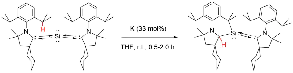 In 2014, Roy et al. reported the intermolecular cyclization of a cAAC-stabilized complex with potassium metal reductant in THF through tertiary C-H bond activation (where the cAAC used ligand is :C(CH2)(CMe2)(C6H10)N-2,6-iPr2C6H3).[4] Cyclic voltammetric analysis of the complex showed a quasi-reversible reduction at E1/2 = –1.55 V vs. Fc/Fc+, indicating one-reduction at the carbene carbon due to its π-accepting character. The quasi-reverisible nature of the signal suggested that the complex then underwent further chemical rearrangement.[4] Reduction using metallic potassium in THF produced a solution that changed color from dark blue to greenish-yellow over the course of the reaction. The yellow solid product was then isolated with 80% yield.[4]