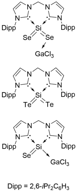 Other chalcogenide structures have also been synthesized. Reaction of (bis-NHC)Si(GaCl3) with selenium can produce the monochalcogenide (bis-NHC)SiSe(GaCl3).[11] Dichalcogenide analogues with Se and Te can also be synthesized, whose structures were confirmed using 29Si{1H}-NMR, infrared spectroscopy (IR), MS, and single-crystal X-ray diffraction.[11] NRT analysis of the SiSe2 and SiTe2 complexes reveals a predominance of the resonance form containing a single Si-X (X = Se, Te) bond with semi-polar character, similar to that of the SiS2 structure[11]