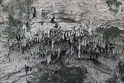 These sinkholes are vertical depressions formed by the cracking, erosion and collapse of limestone over thousands of years.[1][6][7] The Sima de las Cotorras is 140 metres (460 ft) meters deep, and 160 metres (520 ft) in diameter, with a straight drop of 97 metres (318 ft) meters.[1][8] The opening is elliptical, with the north and southwest rims elevated in relation to the rest. The low point of the rim is in the east.[9][7] The process reveals the layers of rock, and about 70 metres (230 ft) meters down, stalactites and stalagmites can be seen among the layers from the surface.[3][10][11] There are also caves within the sinkhole walls, which have also been produced by erosion.[7] This type of sinkhole is similar to those found in the Yucatán, but in general these do not contain pooled water at the bottom.[4]