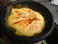 After Mass, Filipinos buy and eat holiday delicacies sold in the churchyard for breakfast. Bibingka (rice cakes cooked above and below) and puto bumbong (steamed purple rice pastries, seasoned with butter, grated coconut, and brown sugar) are popular, often paired with tsokolate (hot chocolate from local cacao) or salabát (ginger tea).[1]