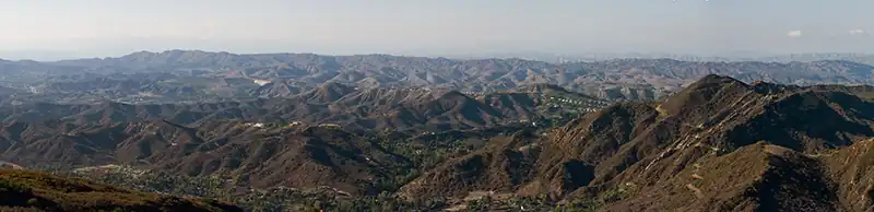 The two nearby mountain ranges are: the higher Santa Susana Mountains adjacent on the northeast across Santa Susana Pass; and the Santa Monica Mountains running nearby along the south.