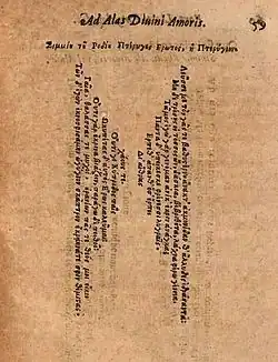 As an epigrammatist, Simmias had a place in the Garland of Meleager, and the Greek Anthology contains six epigrams ascribed to him, besides three short poems of that fantastic species called carmina figurata, that is, pieces in which the lines are so arranged as to make the whole poem resemble the form of some object; those of Simmias are entitled, from their forms, the Pteryges (Wings), the Oon (Egg), and the Pelekys (Hatchet).
