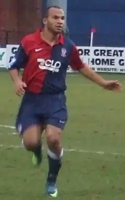 He was involved in a controversy when he wrote a message on the Facebook profile of Wrexham teammate Christian Smith, which regarded Wes Baynes's contract situation at the club, and caused an angry reaction by the fans.[24] Following the completion of his loan spell at Rushden, he was set to join York City on loan.[25] The move was completed on 15 January, when he signed for the rest of the 2008–09 season.[26] He made his debut in a 3–0 victory against Lewes on 17 January as a right midfielder.[27] He featured as a striker as part of a 4-3-3 formation in a 1–1 draw with Altrincham on 27 January.[28] He joined Tamworth on a month's loan on 13 November,[29] making nine appearances before returning to Wrexham in January 2010.[30] On 11 March 2010, he was released from his contract at Wrexham by mutual consent after failing to make a first team appearance for the club all season.[31] He later joined Eastwood Town and made his debut in a 2–1 defeat to Workington.[32]