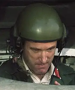 ![]() Cooper in the driver's compartment of an M1 Abrams tank in 1985 | |