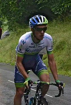 Yates along with his brother joined the Australian UCI World Tour team Orica–GreenEDGE in 2014.[20] He finished 12th overall in one of his first World Tour races, the Tour of the Basque Country. Yates suffered a broken collarbone on Stage 3 of the Tour of Turkey.[21] He recovered to take seventh overall and the young rider classification in the Tour of Slovenia in June. He was a surprise selection for the Orica–GreenEDGE team for the 2014 Tour de France, with only 5 days' notice, and was one of only 4 British riders to take to the Grand Départ startline in Leeds.[22] Yates featured in two breakaways during his Grand Tour debut, before being withdrawn by his team on the second rest day.[23]