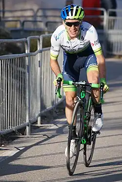 Yates confirmed his and the team's plans for him participating in the Giro d'Italia and the Vuelta a España.[31] In March, Yates won Stage 7 of the Paris–Nice, a mountain top finish to Valdeblore La Colmiane, to take the overall race lead going into the final stage. However, Marc Soler of the Movistar Team, who started 37 seconds down on Yates in sixth place overall, attacked around halfway into the stage along with compatriot David de la Cruz (Team Sky); the duo joined Omar Fraile (Astana) at the head of the race, and the trio managed to stay clear of the rest of the field by the time they reached Nice. As de la Cruz and Fraile contested stage honours, Soler finished third – acquiring four bonus seconds on the finish in addition to three gained at an earlier intermediate sprint – and with a 35-second gap to Yates and the remaining general classification contenders, it was enough to give Soler victory over Yates by four seconds.[32] Later that month, Yates won stage 7 of the Volta a Catalunya after attacking multiple times on the 6.6-kilometre (4.1-mile)-long final circuit through the Montjuïc Park; he finished fourth overall.[33]
