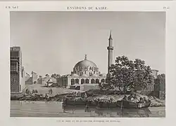 When the mosque was built the site was on the Nile shore which has since shifted westward.[1] The mosque's architecture combines Mamluk and Ottoman features. The last include its free-standing position in a garden and the gallery surrounding its square prayer hall on three sides roofed with eleven shallow domes. The dome roofing the prayer hall is the largest stone dome in Cairo. The mosque has a pencil-shaped minaret at its southern corner. The prayer hall's three entrance portals are decorated with Muqarnas.