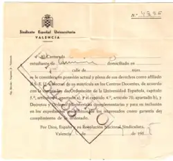 At the end of the Spanish Civil War in 1939, the SEU was proclaimed the sole legal student organization by the Francoist regime, now as part of the FET y de las JONS (following the 1937 Unification Decree). Although all students were formally required to be members, it never succeeded in gaining a foothold in universities across the country, and by the mid-1960s democratically oriented students began to autonomously organize themselves in clandestine organizations, particularly in Catalonia.[1] In 1965, it was practically dismantled by the regime following its infiltration by an underground anti-Francoist group, the Federación Universitaria Democrática Española ("Spanish Democratic University Federation"; FUDE), which had succeeded in obtaining representatives on most university councils.[2]