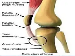 | The site of the OSG and SLJ on the knee: OSG at tibial tuberosity and SLJ at inferior pole of patella | |
