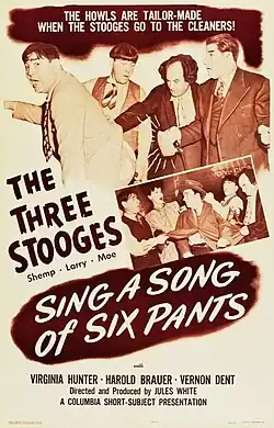 Sing a Song of Six Pants is a 1947 short subject directed by Jules White starring American slapstick comedy team The Three Stooges (Moe Howard, Larry Fine and Shemp Howard). It is the 102nd entry in the series released by Columbia Pictures starring the comedians, who released 190 shorts for the studio between 1934 and 1959.