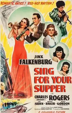 Sing for Your Supper is a 1941 American musical comedy film directed by Charles Barton and starring Jinx Falkenburg, Charles "Buddy" Rogers and Eve Arden.[1] It was produced and distributed by Columbia Pictures.