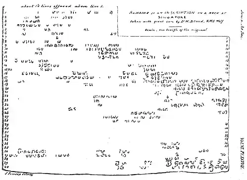 ![]() A black and white photo of the Singapore Stone (above), and an artist's rendering of the inscriptions on the fragment of the Stone from an 1848 article by J.W. Laidlay published in the Journal of the Asiatic Society of Bengal (below) | |