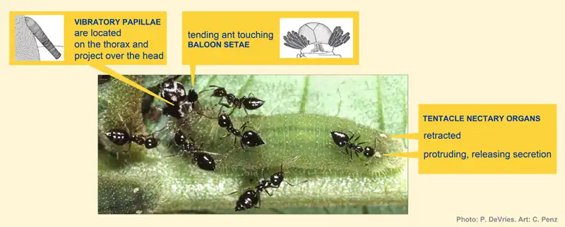 - ^ DeVries, P.J. & Baker, I. (1989) Butterfly exploitation of a plant-ant mutualism: adding insult to herbivory. Journal of the New York Entomological Society 97: 332–340.