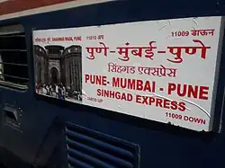 The 11010 / 09 Sinhagad Express runs from Pune Junction via Shivajinagar, Pimpri, Chinchwad, Lonavala, Karjat, Kalyan Junction, Thane, Dadar to Chhatrapati Shivaji Maharaj Terminus.