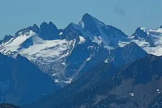 Sinister Peak (8,440+ ft (2,570+ m)) is in Mount Baker-Snoqualmie and Wenatchee National Forests in the U.S. state of Washington.[3] It is situated in Glacier Peak Wilderness and the North Cascades. Not quite 1 mi (1.6 km) east of Dome Peak, Sinister Peak is along a high ridge connecting the two peaks. The Chickamin Glacier is on the north slopes of Sinister Peak while the Garden Glacier is just southeast. Though some of the routes to the summit are technical, it can be reached by a moderate scramble.[2]